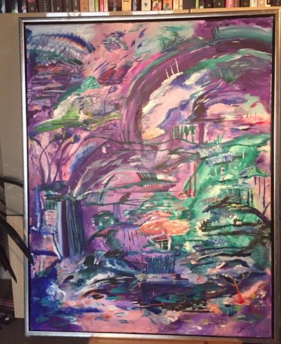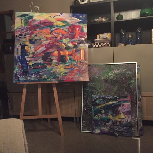 Min senaste tavla som är 1×1 meter är inte klar ännu men jag känner att jag är en bra bit på väg! Denna påbörjades på nyårsafton och det ska bli så spännande att se slutresultatet. Än så länge anar jag en solnedgång, ett kärlekspar, en sovande hund och ett vattenfall. En del måste man ta några steg tillbaka för att urskilja och en del saker måste man stå tätt intill tavlan. Supercoolt! Ett konstverk kan ta kort tid och det kan ta oändliga timmar. Oavsett vad så har de tagit mig hela livet att skapa.