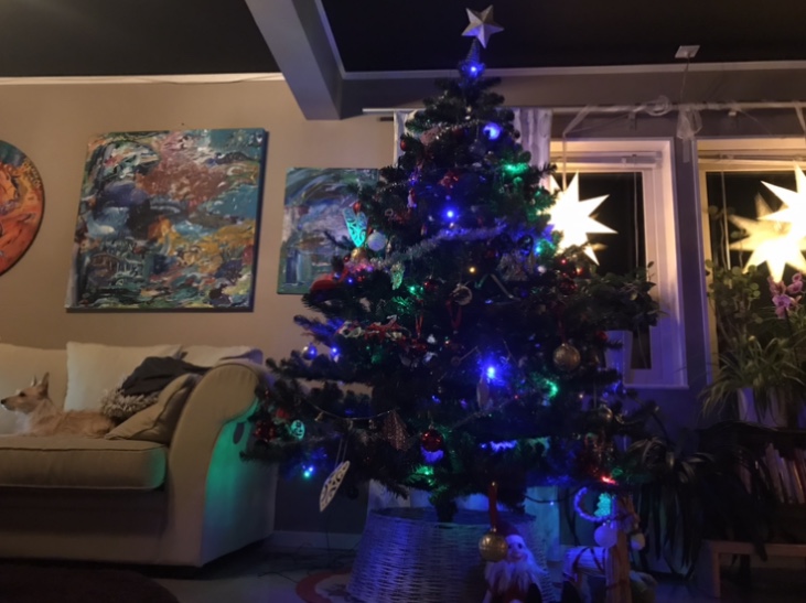 Det måste ha varit minst åtta år sen vi körde ner till Vellingeblomman och köpte oss en riktig MussePigg-gran i plast. Det var snöstorm den dagen och det tog längre tid än väntat att komma dit. Men oj, så mysigt där var. Riktig julstämning! Herrejösses! Den var dyr. Tror att den kostade runt 2400 kronor. Då tyckte jag att det var synd att hugga ner granar som man bara kunde njuta av under en kort tid. Därför investerade vi i en plastgran som vi nu pyntar redan den första advent. Notera LilleB som ligger i soffan 😉