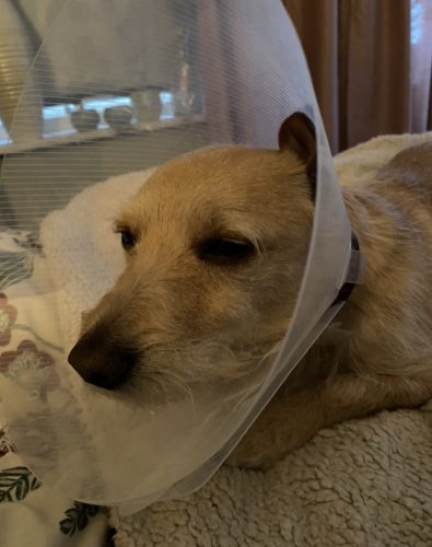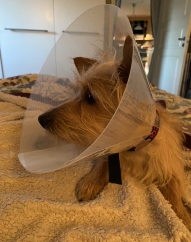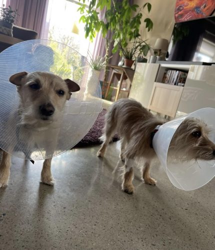 I fredags så kastrerade vi våra hundar med förhoppning om att de ska bli lite lugnare. Jag har läst att de kan bli lätt överviktiga men med tanke på hur smala och smärta de är så ser jag inget problem. Så, nu har vi då två tratthundar som inte riktigt har koll på att tratten är större än deras huvud och som inte kan klia sig som de ska. Som tur är, är jag ledig hela påsklovet och kan rå om dem.