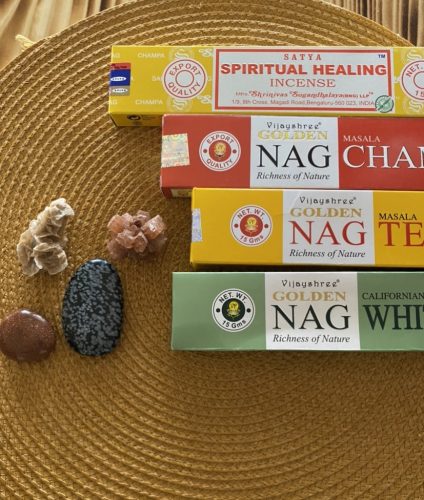 Jag köpte mig några nya stenar och lite rökelse. Det blev fyra stycken stenar och talet fyra är en symbol för stöd, kärlek och inre styrka. När jag nu betraktar bilden så blev det även fyra stycken olika rökelser. Änglarna är med mig. Jag behöver ta lite tid för att fundera över mina mål och rikta all min energi dit jag vill gå.