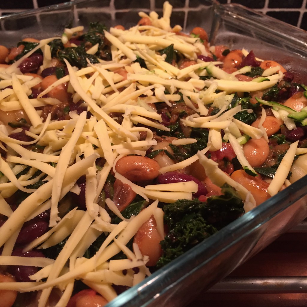 Idag gjorde jag en tacogratäng till min familj. Jag brukar vilja veganisera till mig så jag gjorde ett försök! Jag rotade runt lite i köksskåpen och det blev bönor istället för köttfärs till mig! Den blev ganska kryddstark!! Gott!! Pasta och böngratäng ½ zucchini 2 grönkålskvistar 1 pkt stora vita bönor